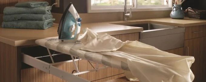 Para apartamentos pequenos, é adequado comprar uma tábua de engomar dobrável – este modelo cabe facilmente atrás da porta ou debaixo da cama. E se precisar de uma solução universal, deve comprar uma tábua de engomar com um suporte, para que o ferro esteja sempre à mão e não ocupe espaço desnecessário.