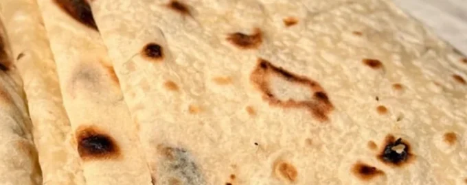 - Dividir a massa em 8 pedaços iguais com cerca de 100 g cada, estender em camadas finas e fritar de ambos os lados num tabuleiro aquecido invertido, como mostra o vídeo.